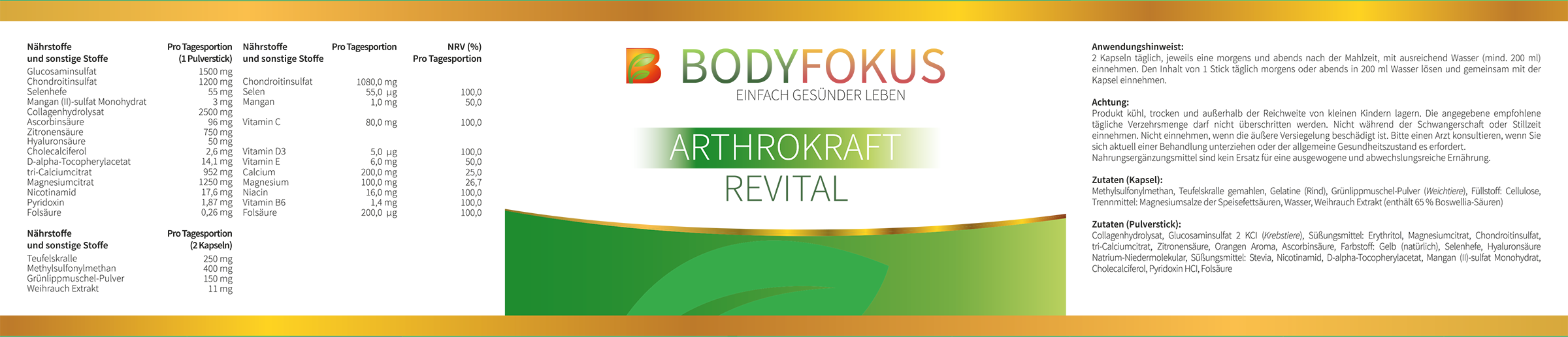 ArthroKraft Revital ist ein Nahrungsergänzungsmittel, das vom deutschen Hersteller BodyFokus produziert und seit dem Jahr 2016 verkauft wird. Das Produkt enthält 18 verschiedene Wirkstoffe, die laut Hersteller aus natürlichen Quellen stammen und auf vielfältige Weise den Körper unterstützen sollen.